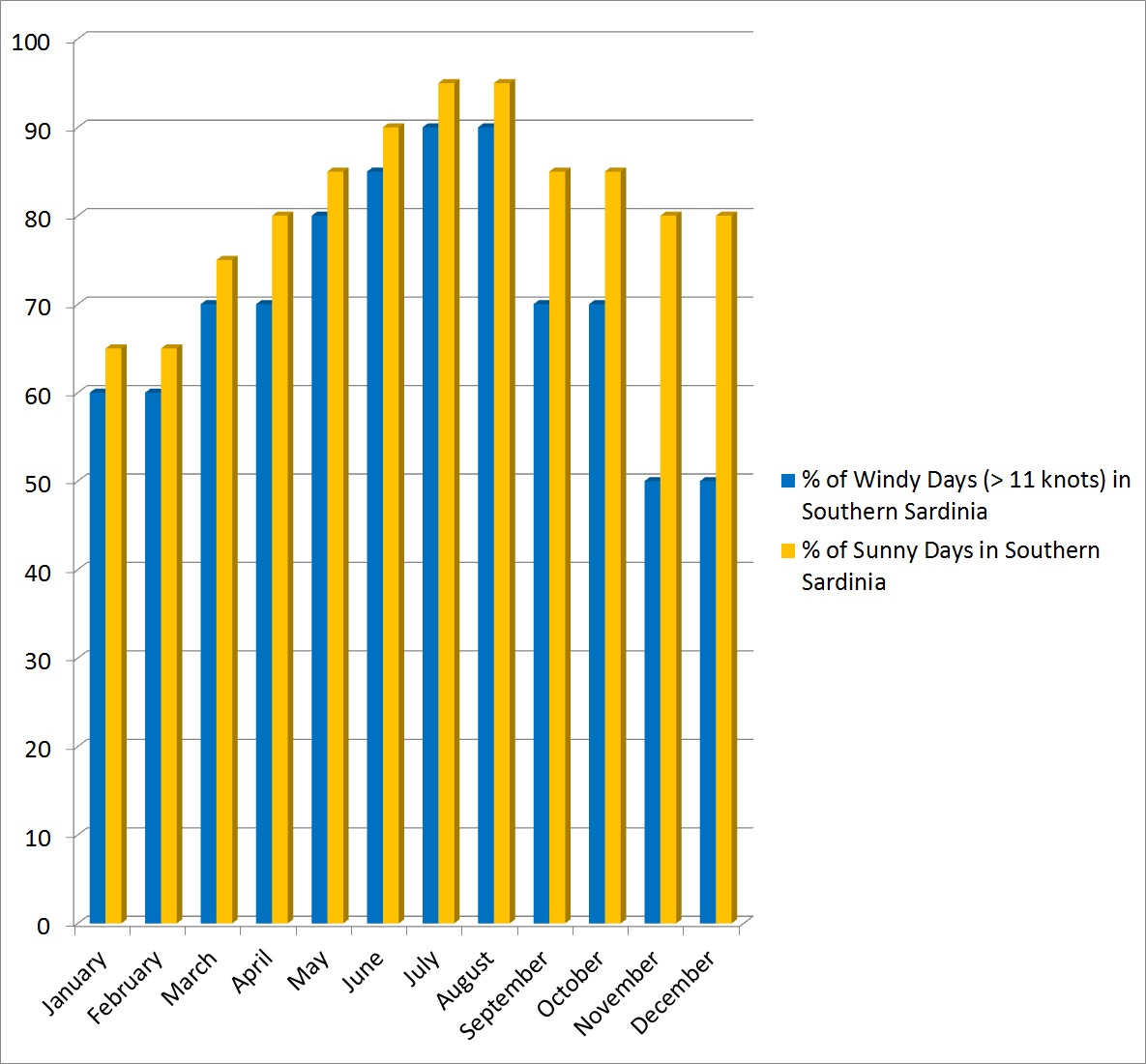 Die Prozentsätze der windigen und sonnigen Tage in Sardinien können in der folgenden Tabelle und Grafik zusammengefasst werden: